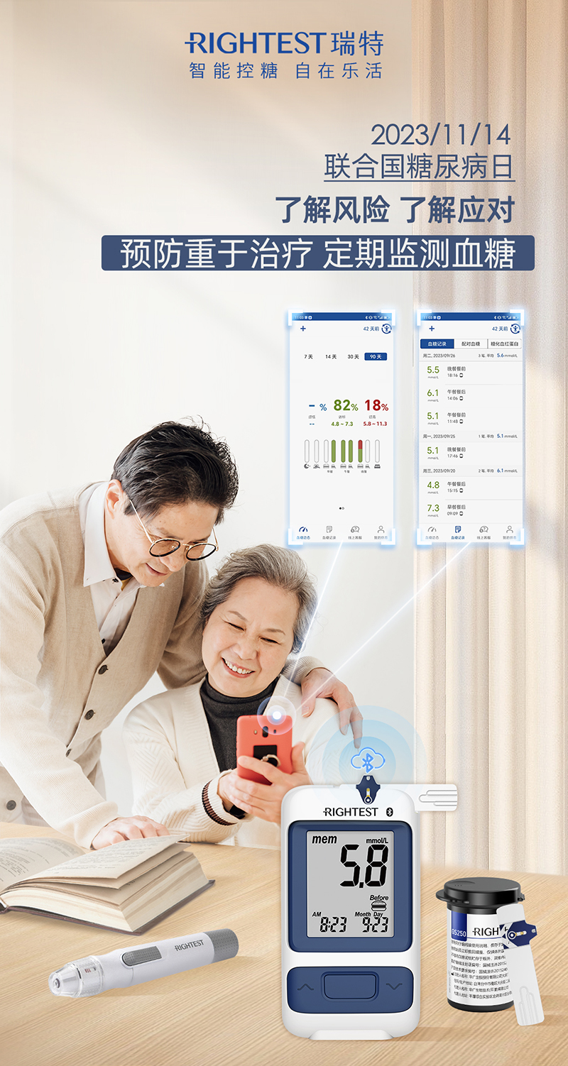 4、自我監(jiān)測:使用瑞特血糖儀監(jiān)測血糖,掌握血糖數(shù)據(jù),出現(xiàn)異常波動情況及時咨詢醫(yī)學(xué)專業(yè)人士;