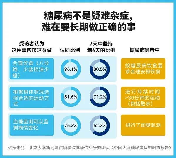 近日,由北京大學(xué)新聞與傳播學(xué)院健康傳播研究團(tuán)隊調(diào)研編制的《中國大眾糖尿病認(rèn)知調(diào)查報告》正式發(fā)布?!秷蟾妗凤@示,我國公眾對糖尿病的認(rèn)知水平仍處于較為基礎(chǔ)的階段,主要表現(xiàn)在“公眾對糖尿病危害的認(rèn)知明顯不足”、“糖尿病高危因素識別存在盲區(qū)”、“對糖尿病治療手段的認(rèn)知較為片面”等等,均表明在提升糖尿病的預(yù)防以及治療水平兩方面都面臨著挑戰(zhàn)。糖尿病已成重大健康威脅,公眾認(rèn)知仍顯不足根據(jù)國際糖尿病聯(lián)盟(IDF)最新發(fā)布的數(shù)據(jù)表明,截至2021年,中國20-79歲人群中糖尿病的患病率為10.6%,患病人數(shù)達(dá)到了1.41億,是世界上糖尿病患者最多的國家。不僅如此,從1990年到2021年,中國總體糖尿病的年齡標(biāo)準(zhǔn)化發(fā)病率、患病率和DALYs(傷殘調(diào)整生命年)都呈現(xiàn)上升趨勢,并且已經(jīng)和腎病一道躍升為中國第五大死亡原因。 更加令人擔(dān)憂的是,在已患有糖尿病的患者中,很可能有超過一半的人不知道自己已經(jīng)患病。中國醫(yī)科大學(xué)滕衛(wèi)平團(tuán)隊通過調(diào)查全國7.59萬名成年受試者發(fā)現(xiàn),糖尿病患者中,僅有43.3%的患者知道自己患有糖尿病,其余56.7%的患者不知道自己患病。這些數(shù)據(jù)表明,提高公眾對于糖尿病的認(rèn)知非常有必要。糖尿病認(rèn)知——認(rèn)知度與危險度呈現(xiàn)反比例血糖升高是糖尿病的表現(xiàn)形式之一,而糖尿病最為嚴(yán)重的危害則在于血糖長期處于較高水平所可能衍生出的各類并發(fā)癥,如心腦血管病變、視網(wǎng)膜病變、腎臟病變、神經(jīng)系統(tǒng)病變、足部病變等。根據(jù)《報告》的調(diào)查結(jié)果可以發(fā)現(xiàn),公眾除了對體形消瘦、腎臟病變和視力下降這三項糖尿病可能引發(fā)的危害,認(rèn)知率尚可,對于其他類型的,特別是那些死亡風(fēng)險較高的危害,反而認(rèn)知不足。例如,糖尿病患者發(fā)生心腦血管疾病的危險性較同年齡、性別的非糖尿病人群高出2-4倍,但只有43.0%的受訪者知曉糖尿病與血管疾病之間的關(guān)聯(lián)。由此可見,當(dāng)前公眾對糖尿病的危害并未形成充分的認(rèn)知。 另一個值得注意的現(xiàn)象是,我國的糖尿病易感群體相較其他群體對于糖尿病的認(rèn)知率反而更低?!秷蟾妗分嗅槍Α熬米腿狈w力勞動兩個人群是糖尿病易感群體”的調(diào)查顯示,學(xué)生群體和上班群體作為久坐和缺乏體力活動最為明顯的群體,他們對“久坐群體為易感群體”的認(rèn)知率分別為32.25%和40.43%,對“缺乏體力勞動群體為易感群體”的認(rèn)知率分別為47.74%和50.55%,4項數(shù)據(jù)均未達(dá)到及格線。作為“高風(fēng)險人群”,上班族和學(xué)生黨本身并未對自身可能會患有糖尿病具備足夠的認(rèn)知。《報告》指出,糖尿病易感人群的識別主要有兩方面意義:首先,對于個體而言,了解易感人群的特征,將有助于其判斷自身風(fēng)險水平,及時調(diào)整干預(yù);其次,從社會化干預(yù)角度來講,當(dāng)個體了解易感人群的特征,其就可以通過這些特征對身邊的親友家人進(jìn)行判斷,作為“重要他者”,推動身邊人的及早干預(yù)。而對于以糖尿病為代表的慢性病來說,另一大挑戰(zhàn)就是長期的管理治療。例如,治療依從性始終是胰島素治療的難以邁過的一道坎,頻繁的注射扎針,復(fù)雜的病程管理等,讓未進(jìn)行胰島素治療的患者望而卻步,正在進(jìn)行胰島素治療的患者身心俱疲。受訪者認(rèn)為,糖尿病的管理過程之復(fù)雜,涉及飲食、運動、藥物以及定期監(jiān)測等多個方面。這讓他們在執(zhí)行治療計劃時壓力倍增,嚴(yán)重影響了治療依從性。即使努力遵循醫(yī)生的建議,但在實際執(zhí)行中,正常的治療計劃仍會受到如工作、家庭、自身情緒等不確定因素的干擾。不做“糖人”,構(gòu)筑自我健康防線,從血糖監(jiān)測開始歸根到底,糖尿病的治療主要是將血糖穩(wěn)定在一個合適的區(qū)間內(nèi),對于患者來說,過高和過低都是不可取的,因此,需要日常監(jiān)測血糖,及時調(diào)整藥物和胰島素的劑量。另外,還需要監(jiān)測眼底、尿微量白蛋白、心電圖等指標(biāo),以便及時發(fā)現(xiàn)糖尿病的并發(fā)癥。 血糖監(jiān)測是糖尿病管理的“五駕馬車”之一,是糖尿病管理中的重要組成部分。通過血糖監(jiān)測,患者可以了解自己的血糖波動情況,及時發(fā)現(xiàn)低血糖或高血糖事件,預(yù)防并發(fā)癥的發(fā)生。此外,血糖監(jiān)測也是評價藥物治療效果、調(diào)整飲食和運動計劃的直接依據(jù)。血糖監(jiān)測的時間點包括三餐前、三餐后2小時、睡前、午夜及其他時間點的隨機血糖(尤其有低血糖癥狀時)。病情不同的患者可以根據(jù)自身情況靈活選擇血糖監(jiān)測的時間及頻率:血糖控制良好的患者可以每周測1天~2天空腹和餐后2小時的血糖;血糖控制不佳的患者最好能做到每周4天~7天進(jìn)行全天血糖監(jiān)測,每天4次~7次;低血糖風(fēng)險高的患者要重視午夜血糖、餐前血糖和有低血糖癥狀時的即時血糖。目前,市面上的便攜式血糖儀種類繁多,首選準(zhǔn)確度高的,其次就是操作便捷性最好是能連接手機,符合ISO15197:2013(±15%)國際標(biāo)準(zhǔn)