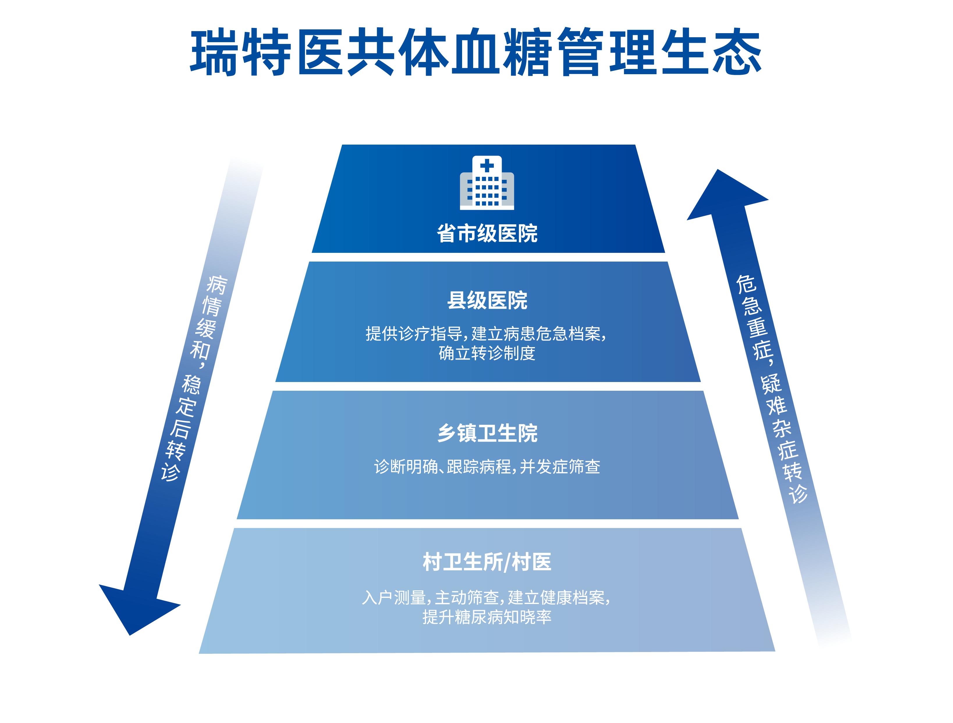 具體來說,鄉(xiāng)村醫(yī)生可利用瑞特血糖儀對居民進(jìn)行定期血糖篩查,數(shù)據(jù)可直接回傳至血糖管理系統(tǒng)及醫(yī)院HIS端。系統(tǒng)根據(jù)患者的血糖數(shù)據(jù)預(yù)警高低危急值,及時發(fā)現(xiàn)潛在的高低血糖患者,為后續(xù)分級診療奠定基礎(chǔ)。實現(xiàn)與上下級醫(yī)療機構(gòu)的雙向轉(zhuǎn)診。一方面,鄉(xiāng)鎮(zhèn)衛(wèi)生院可以將需要進(jìn)一步檢查或治療的患者及時轉(zhuǎn)診至上級醫(yī)院;另一方面,上級醫(yī)院也可以將經(jīng)過治療、病情穩(wěn)定的患者轉(zhuǎn)回鄉(xiāng)鎮(zhèn)衛(wèi)生院,進(jìn)行后續(xù)管理。如此有序的運作,確保了患者能夠在不同層級的醫(yī)療機構(gòu)之間得到精準(zhǔn)對接和連續(xù)治療。