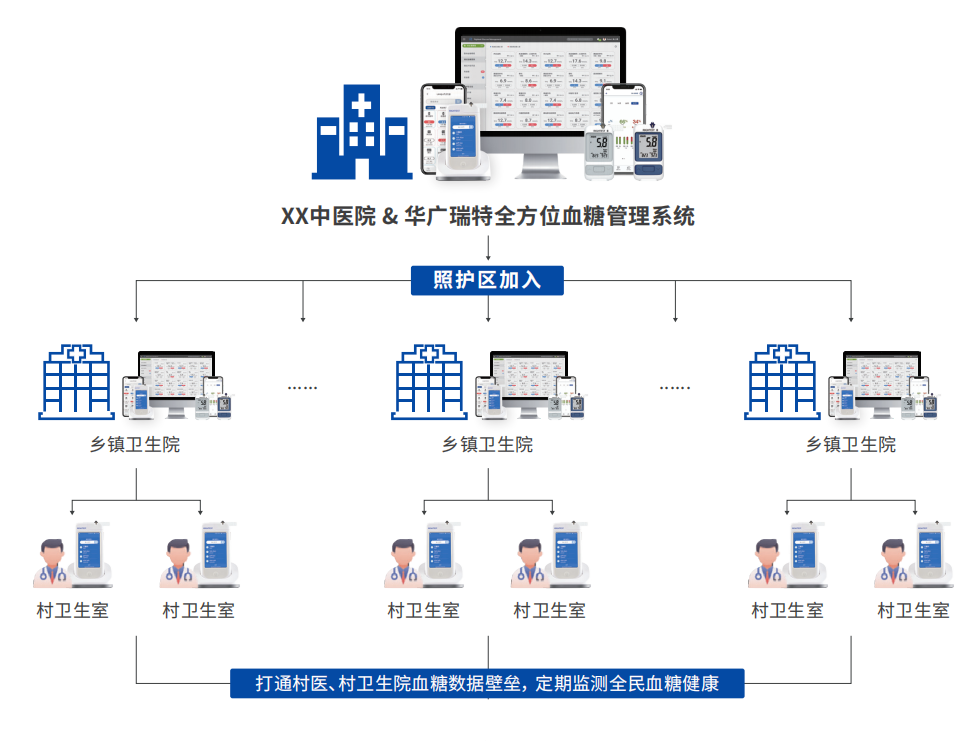 瑞特全方位智能血糖管理系統(tǒng)能夠打通縣級主體醫(yī)院、轄區(qū)鄉(xiāng)鎮(zhèn)衛(wèi)生院和社區(qū)衛(wèi)生服務(wù)機構(gòu)的信息鏈路,構(gòu)建慢病管理信息化的“六個一”日,即“一張網(wǎng)、一套標(biāo)準(zhǔn)、一朵云、一個中心、一池數(shù)據(jù)、一體化”服務(wù),實現(xiàn)區(qū)域內(nèi)資源共建共享,管理目標(biāo)同質(zhì),服務(wù)優(yōu)質(zhì)高效,為縣域內(nèi)基層首診、雙向轉(zhuǎn)診、急慢分治打下基礎(chǔ)。