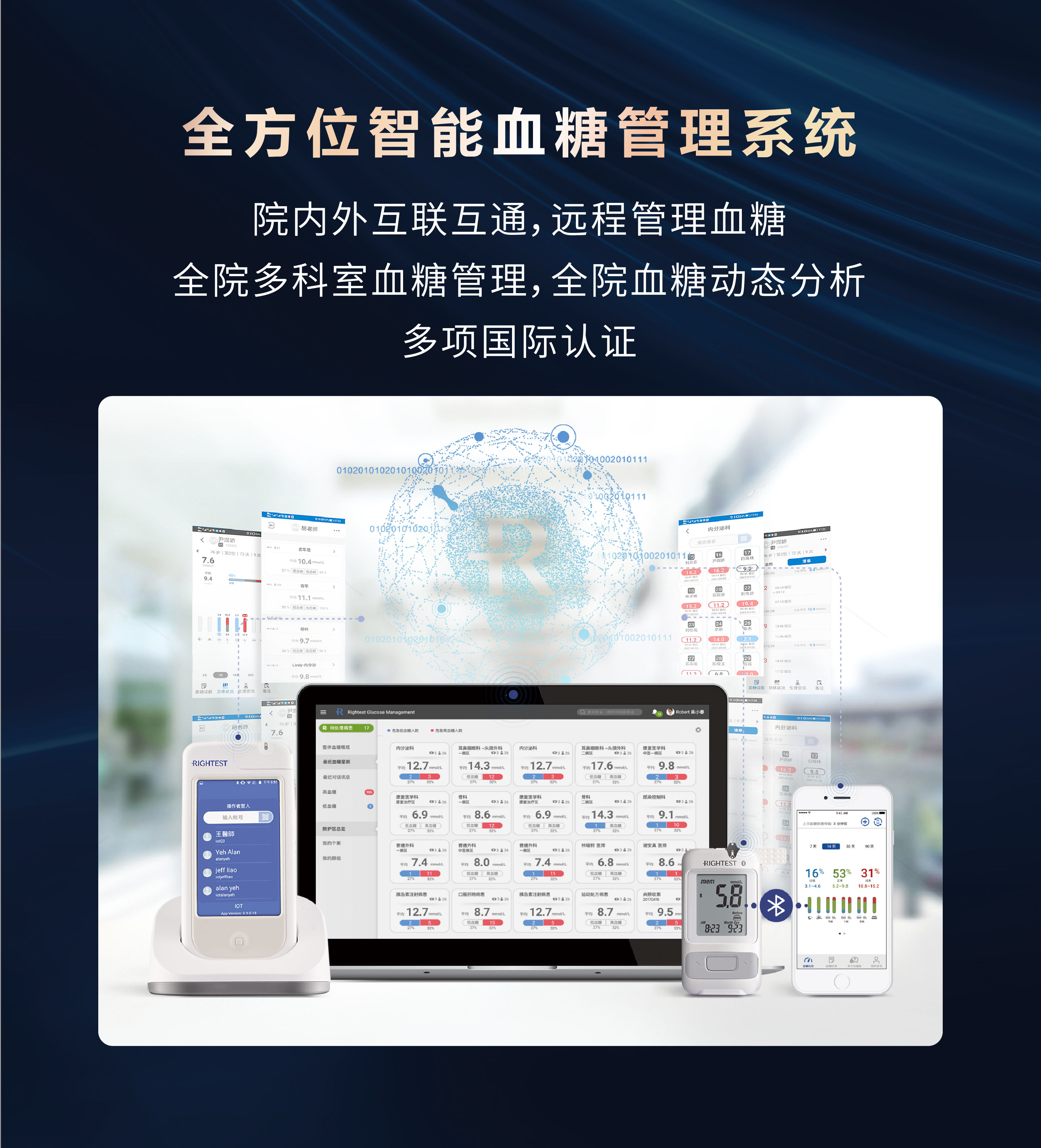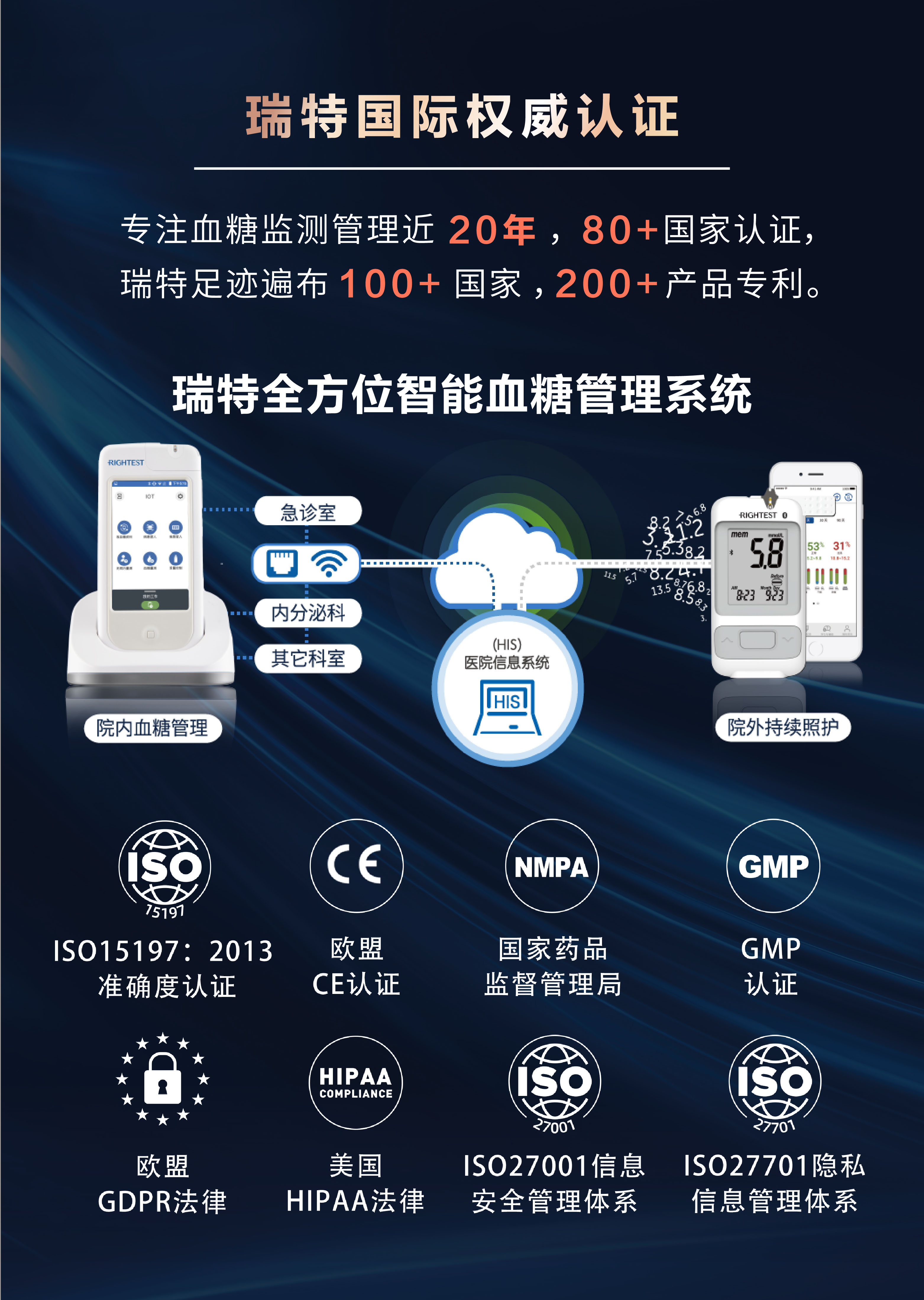 瑞特成功整合了先進(jìn)的醫(yī)療、化學(xué)、電子與精密制造技術(shù),獲得多項(xiàng)獨(dú)特的血糖檢測專利,采用黃金電極專利技術(shù),確保每一次血糖測量數(shù)據(jù)的準(zhǔn)確性。迄今為止,瑞特產(chǎn)品在全球已經(jīng)取得超過80個國家的權(quán)威認(rèn)證,產(chǎn)品銷售遍布全球100多個國家和地區(qū),瑞特血糖管理系統(tǒng)成功入駐500多家醫(yī)院,瑞特血糖儀產(chǎn)品供貨國內(nèi)3000多家醫(yī)院。
