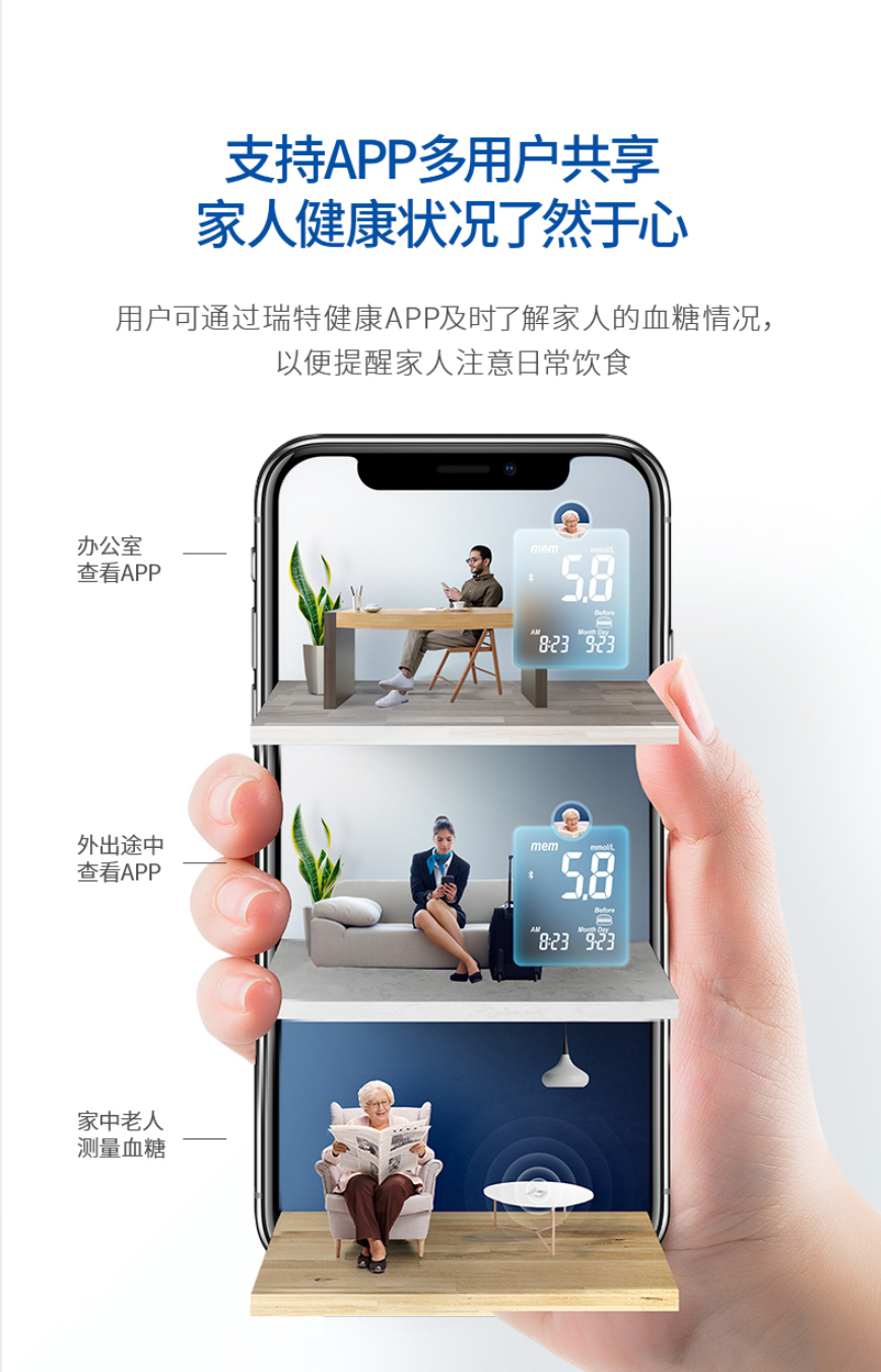 此外,測量數(shù)據(jù)上傳至瑞特健康APP后,可記錄7天、14天、30天以及90天的血糖平均值,有效監(jiān)控長短期血糖波動趨勢,便于后續(xù)及時調整用藥及治療方案,助力血糖平穩(wěn);還能設置餐前、餐后測糖智能提示,以及紀錄血糖達標情況;APP可根據(jù)測量計劃實時推送消息提醒,記錄個人糖類、胰島素用藥及運動記錄,標記晨起、三餐前后、睡前的血糖狀態(tài)。瑞特健康APP支持多用戶共享,即使遠隔千里也能第一時間掌握父親和家人的血糖狀況,以便提醒他們注意日常飲食。