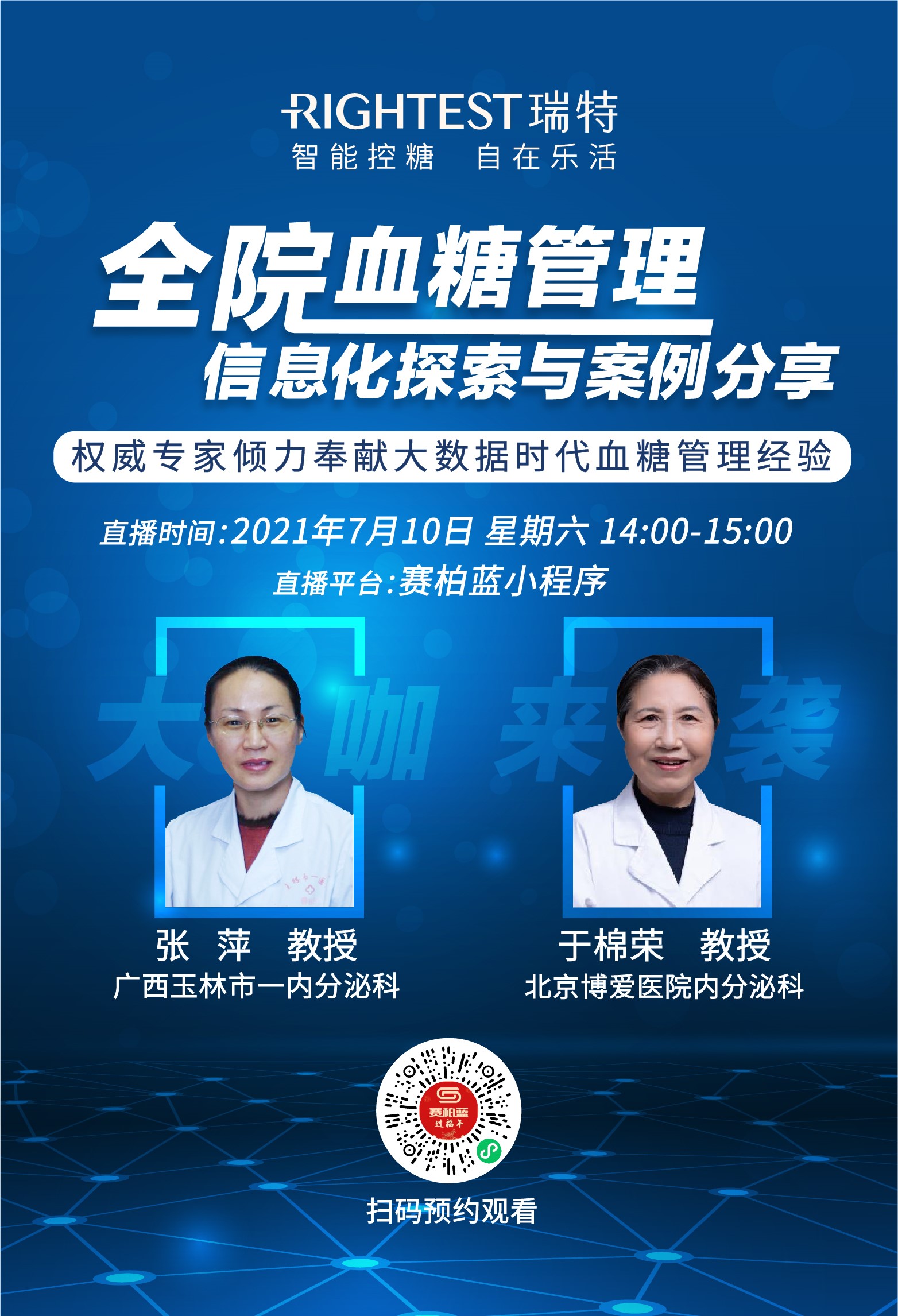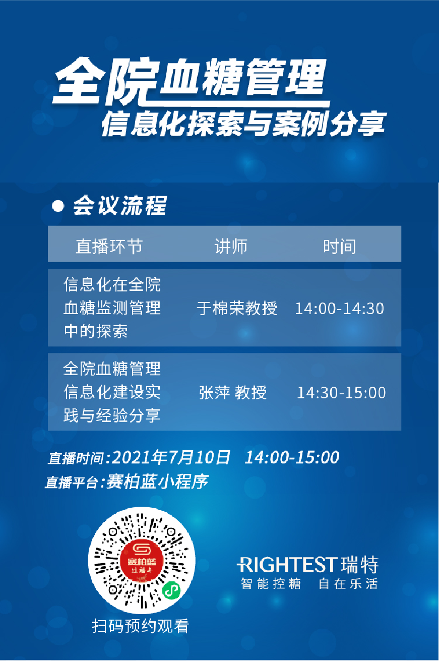 互聯(lián)網(wǎng)技術(shù)日益發(fā)展的今天,這一問(wèn)題是否已經(jīng)有了理想的解決方案?華廣瑞特?cái)y手醫(yī)療行業(yè)垂直平臺(tái)“賽柏藍(lán)”將邀請(qǐng)張萍、于棉榮兩位內(nèi)分泌科資深專家于7月10日進(jìn)行線上學(xué)術(shù)直播會(huì)議,結(jié)合當(dāng)前政策背景及嘉賓豐富的從業(yè)經(jīng)驗(yàn)帶來(lái)全院血糖信息化管理的經(jīng)驗(yàn)分享。