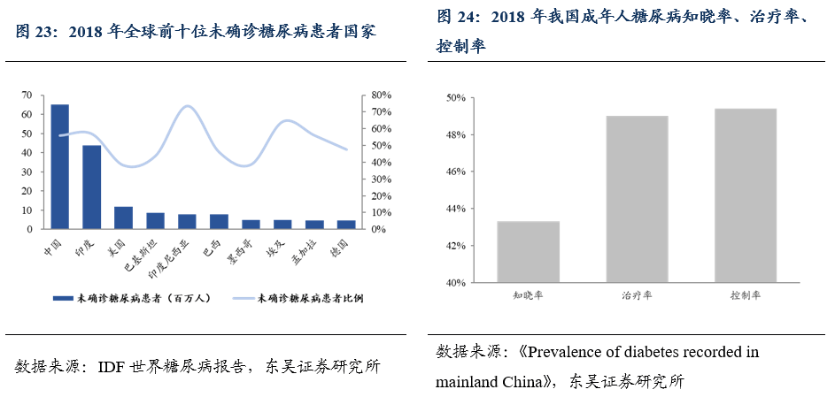 誠(chéng)然,和我國(guó)與日俱增的糖尿病壓力相對(duì)的,是國(guó)民對(duì)于血糖監(jiān)測(cè)意識(shí)的缺乏。據(jù)統(tǒng)計(jì),2018年我國(guó)成年人對(duì)于糖尿病知曉率僅為43.3%,治療率僅為49.0%,控制率僅為49.4%。根據(jù)中國(guó)產(chǎn)業(yè)信息網(wǎng)調(diào)研,2019年我國(guó)糖尿病患者血糖儀滲透率僅在25%左右,與歐美國(guó)家90%的血糖儀滲透率相距甚遠(yuǎn)。