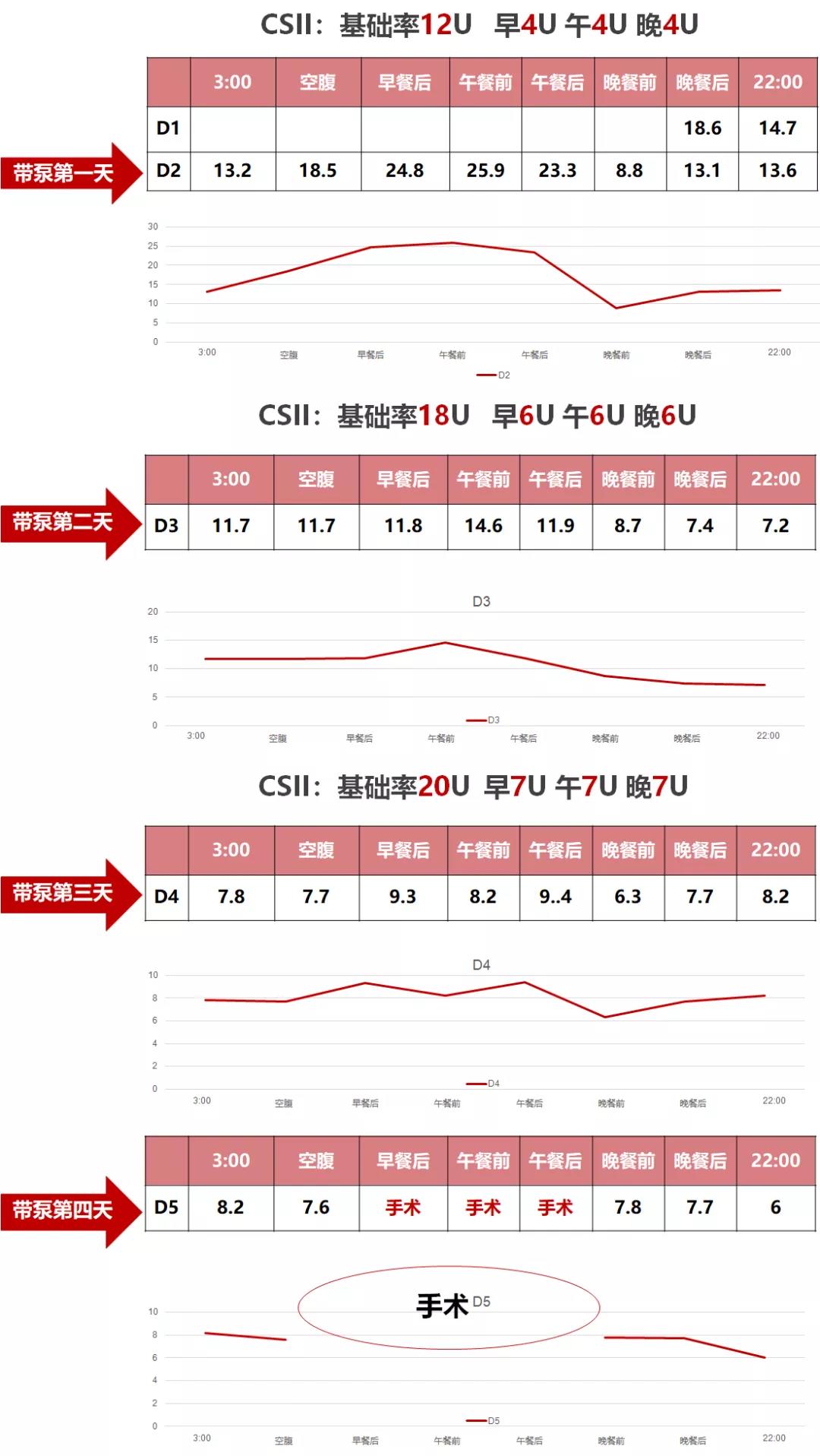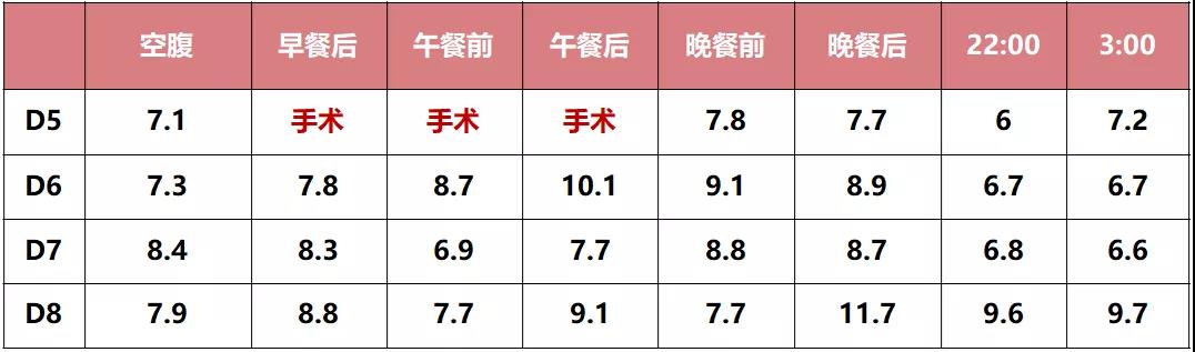患者帶泵治療的胰島素起始劑量為基礎(chǔ)率12 U+大劑量4-4-4 U,之后逐漸增加胰島素劑量,帶泵第3天劑量增至基礎(chǔ)率20 U+大劑量7-7-7 U;帶泵第4天血糖達(dá)標(biāo),凌晨3點(diǎn)血糖在8.2 mmol/L,清晨空腹血糖7.6 mmol/L,遂行手術(shù)治療,術(shù)后當(dāng)天晚餐前后及夜間血糖也均控制在目標(biāo)范圍內(nèi)(圖2)。